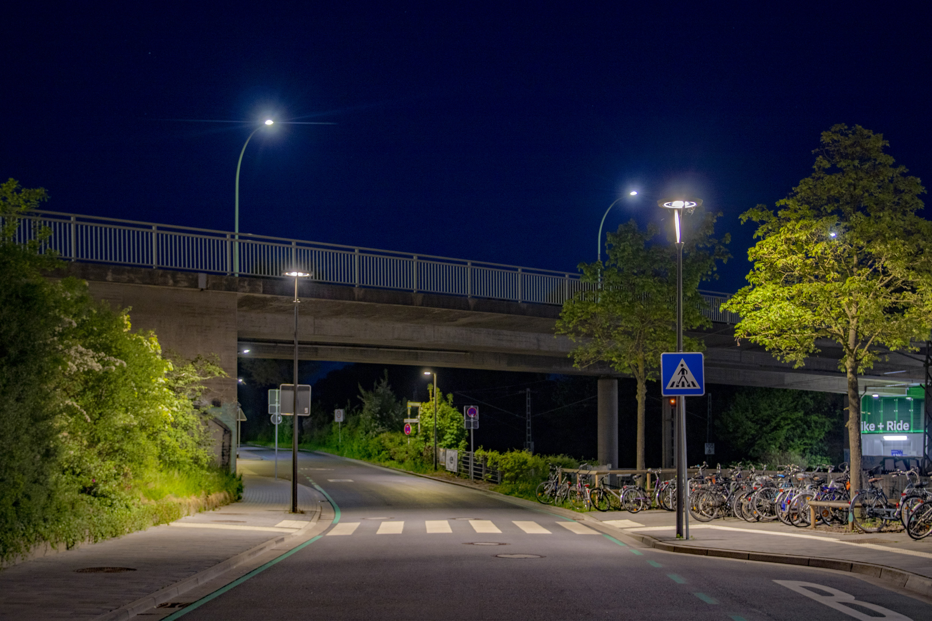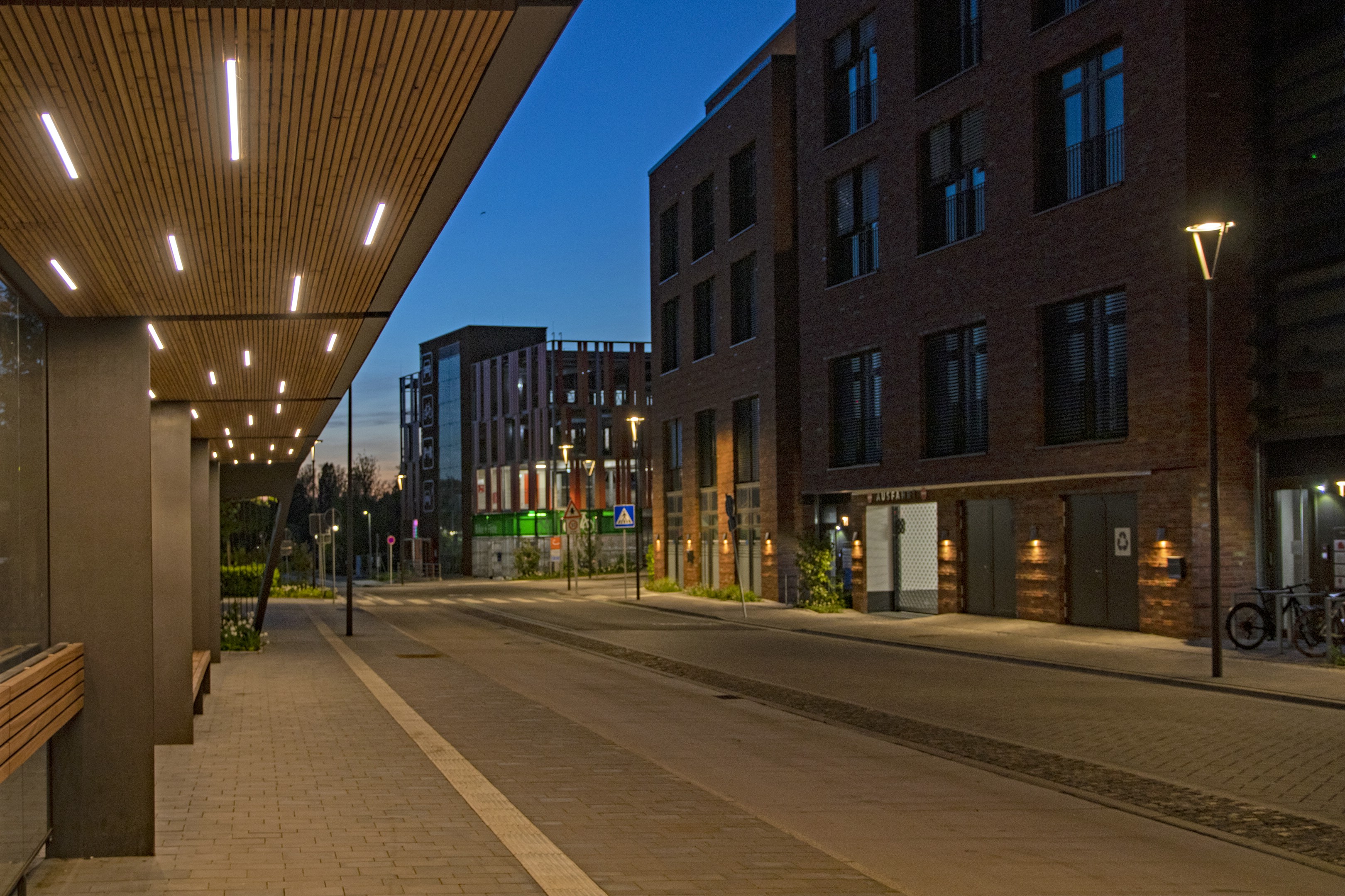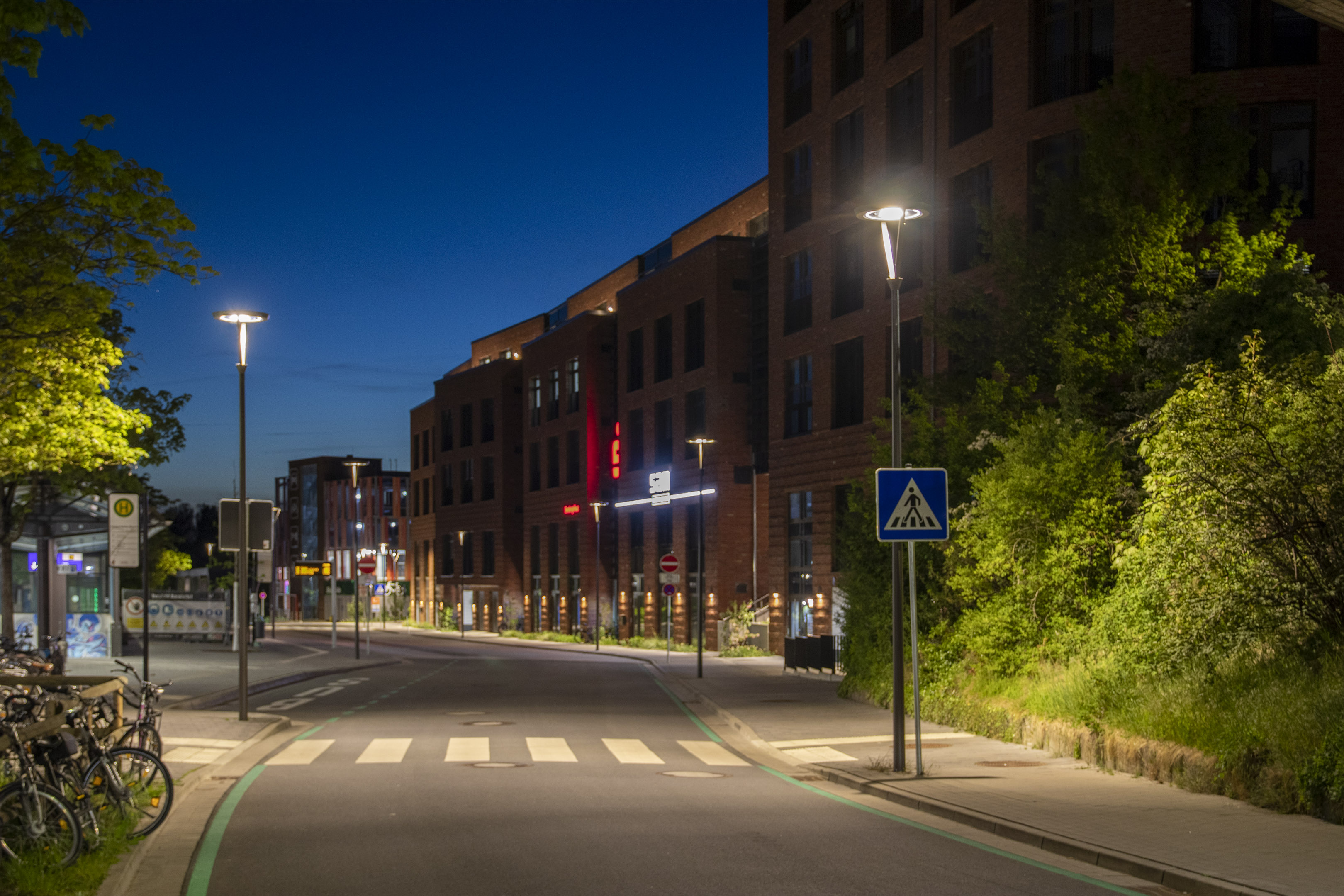 Ein modernes Lichtkonzept sorgt hier für Sicherheit, Orientierung und Atmosphäre. Speziell entwickelte multifunktionale Mastleuchten vereinen Straßen-, Radweg-, Haltestellen- und Fußgängerüberwegbeleuchtung in einem System. Der integrierte Lichtring reduziert Blendung und schafft eine harmonische Verbindung zum Buswartedach.