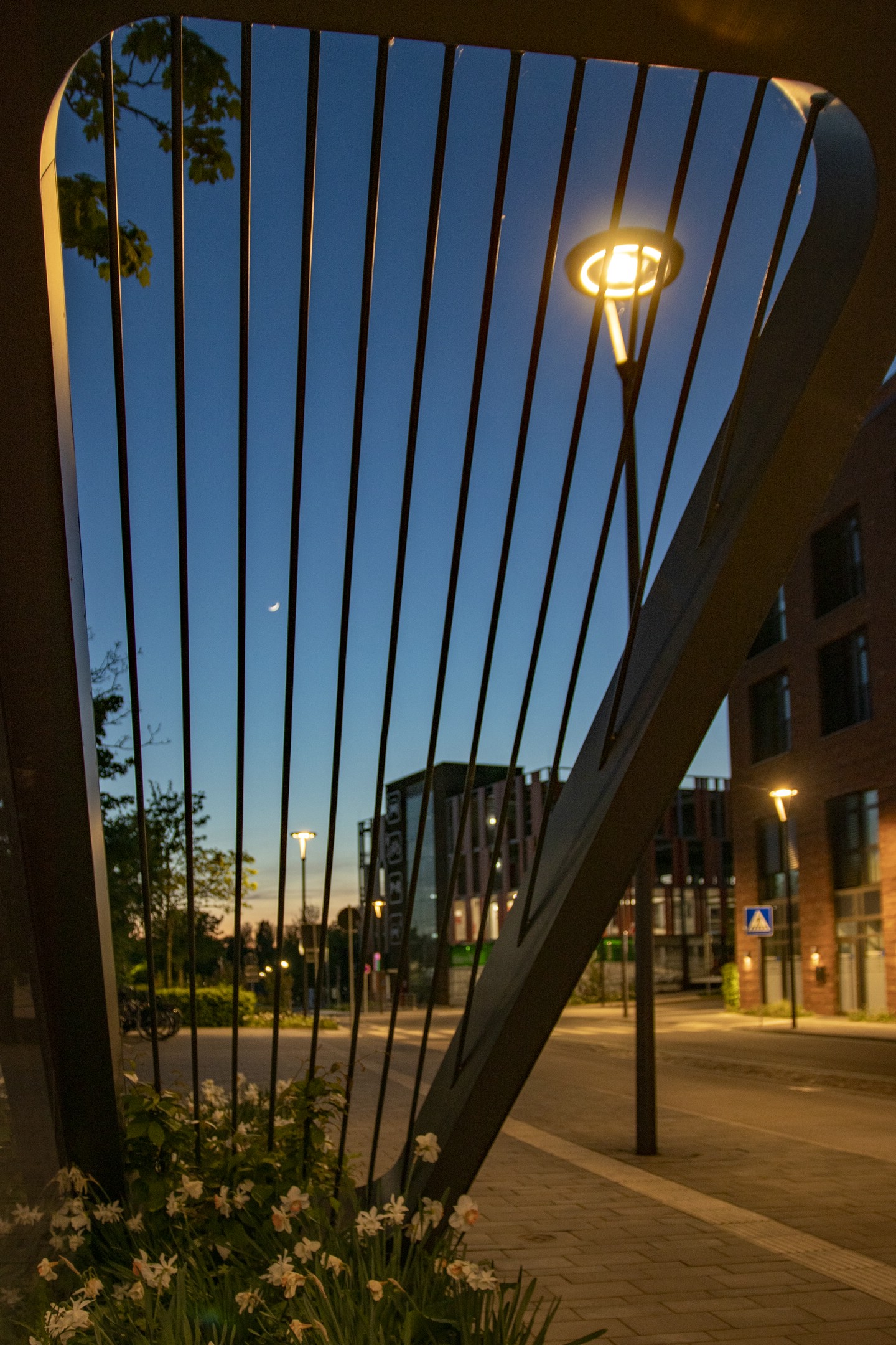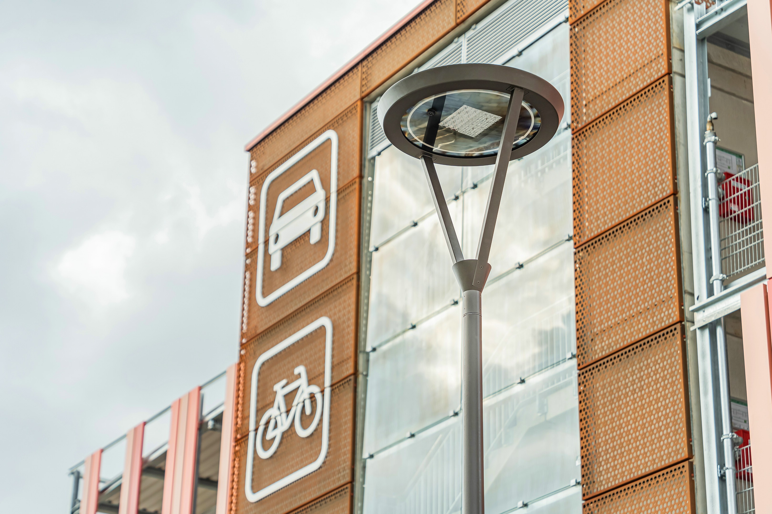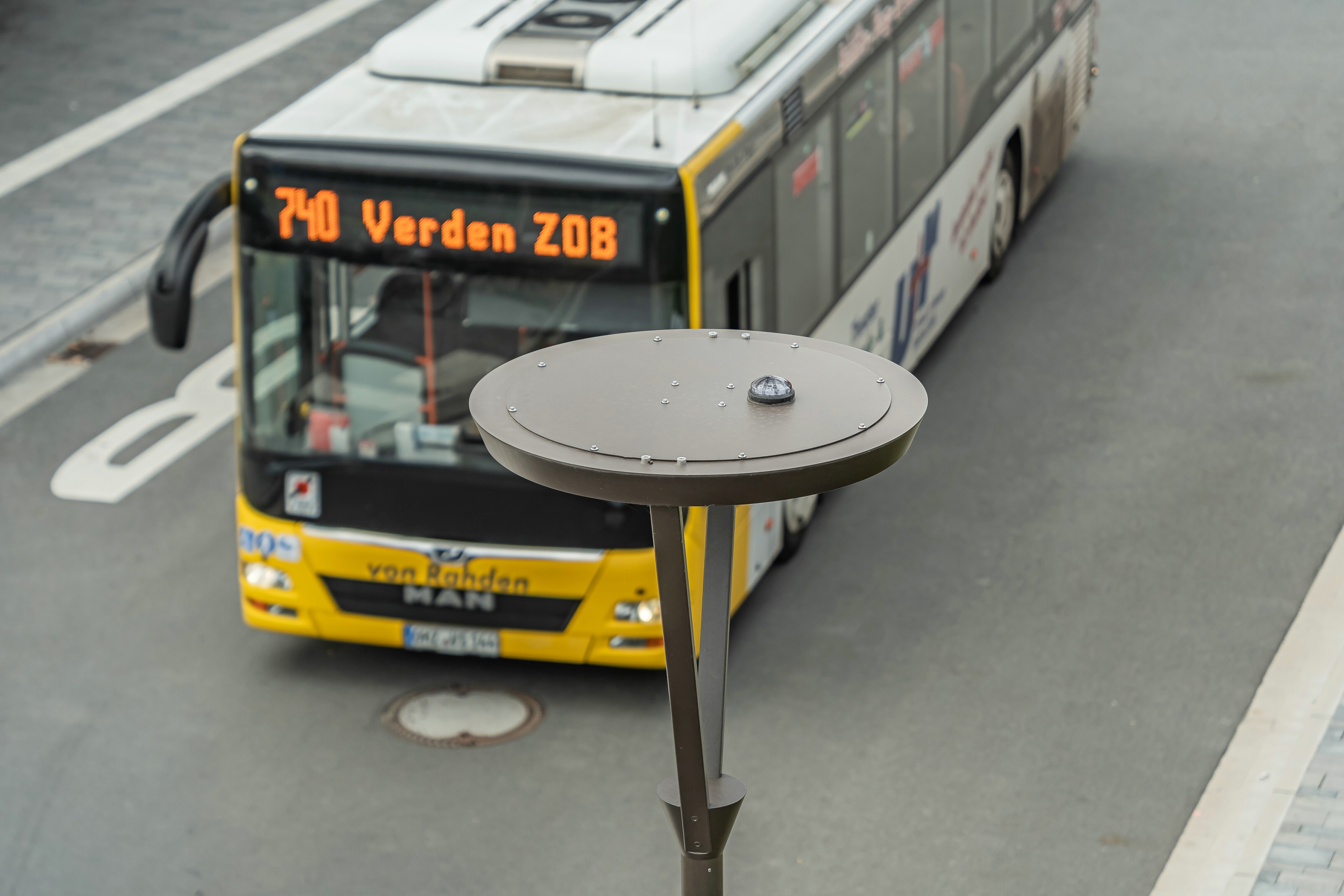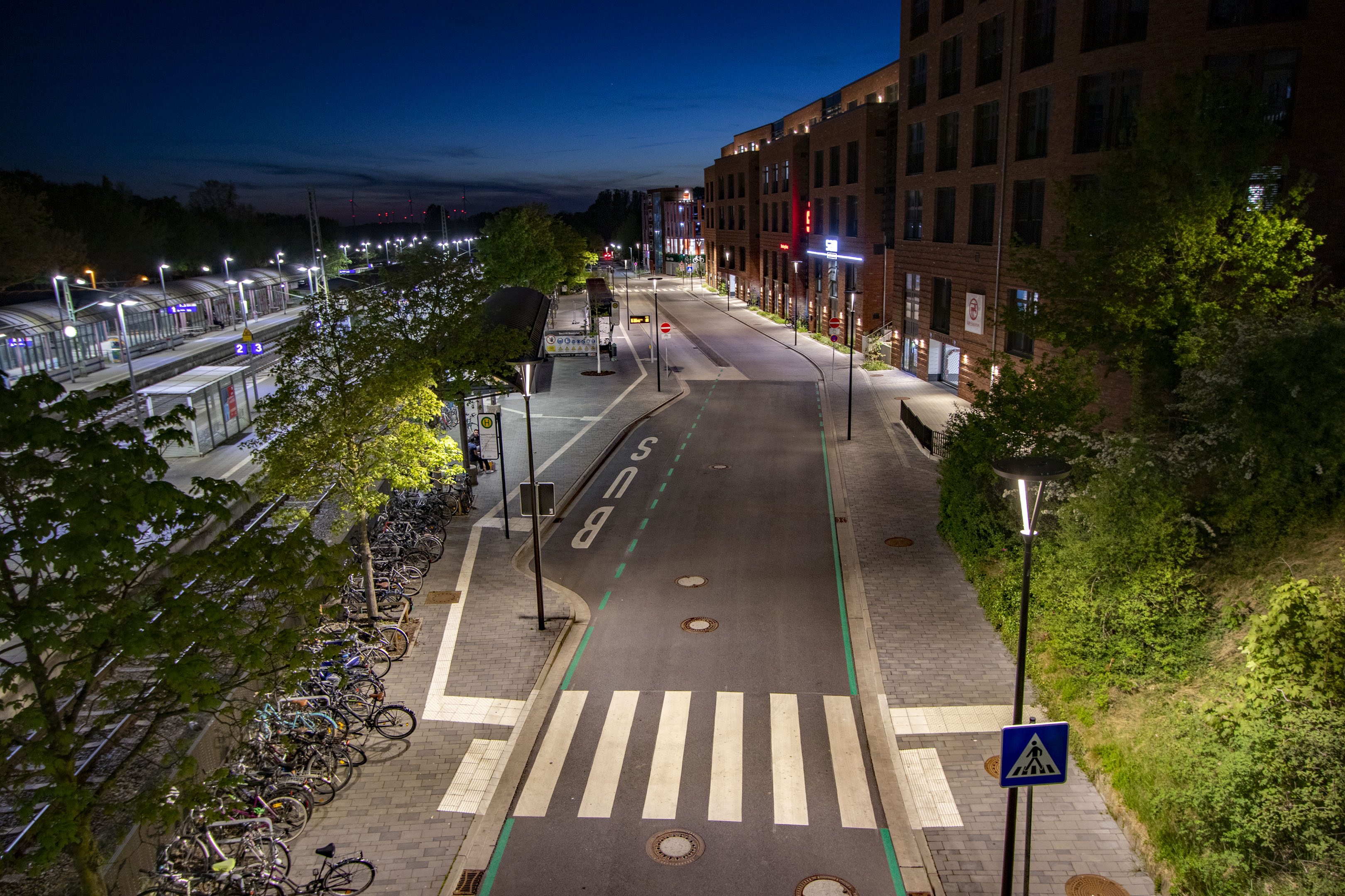 Ein modernes Lichtkonzept sorgt hier für Sicherheit, Orientierung und Atmosphäre. Speziell entwickelte multifunktionale Mastleuchten vereinen Straßen-, Radweg-, Haltestellen- und Fußgängerüberwegbeleuchtung in einem System. Der integrierte Lichtring reduziert Blendung und schafft eine harmonische Verbindung zum Buswartedach.