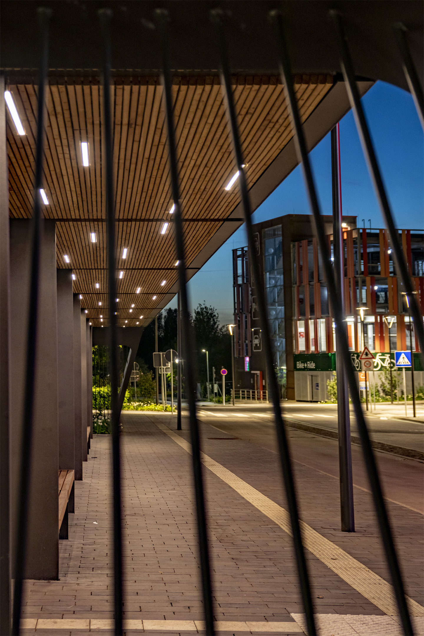 Ein besonderes Highlight ist das Buswartedach mit integrierten Lichtlinien – Symbol für Bewegung und Vernetzung. Es dient bei Dunkelheit als leuchtendes Orientierungselement mit hohem Wiedererkennungswert.