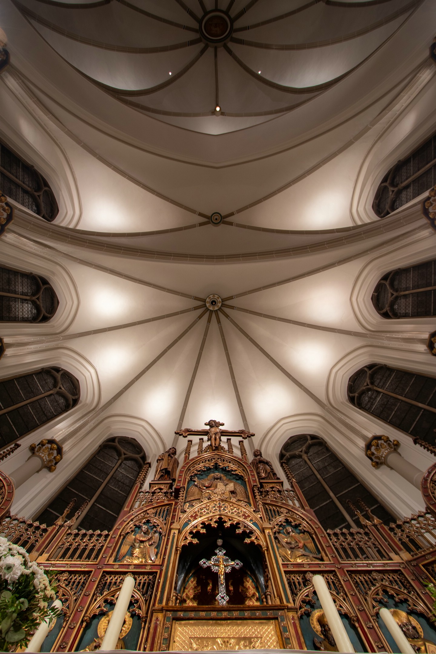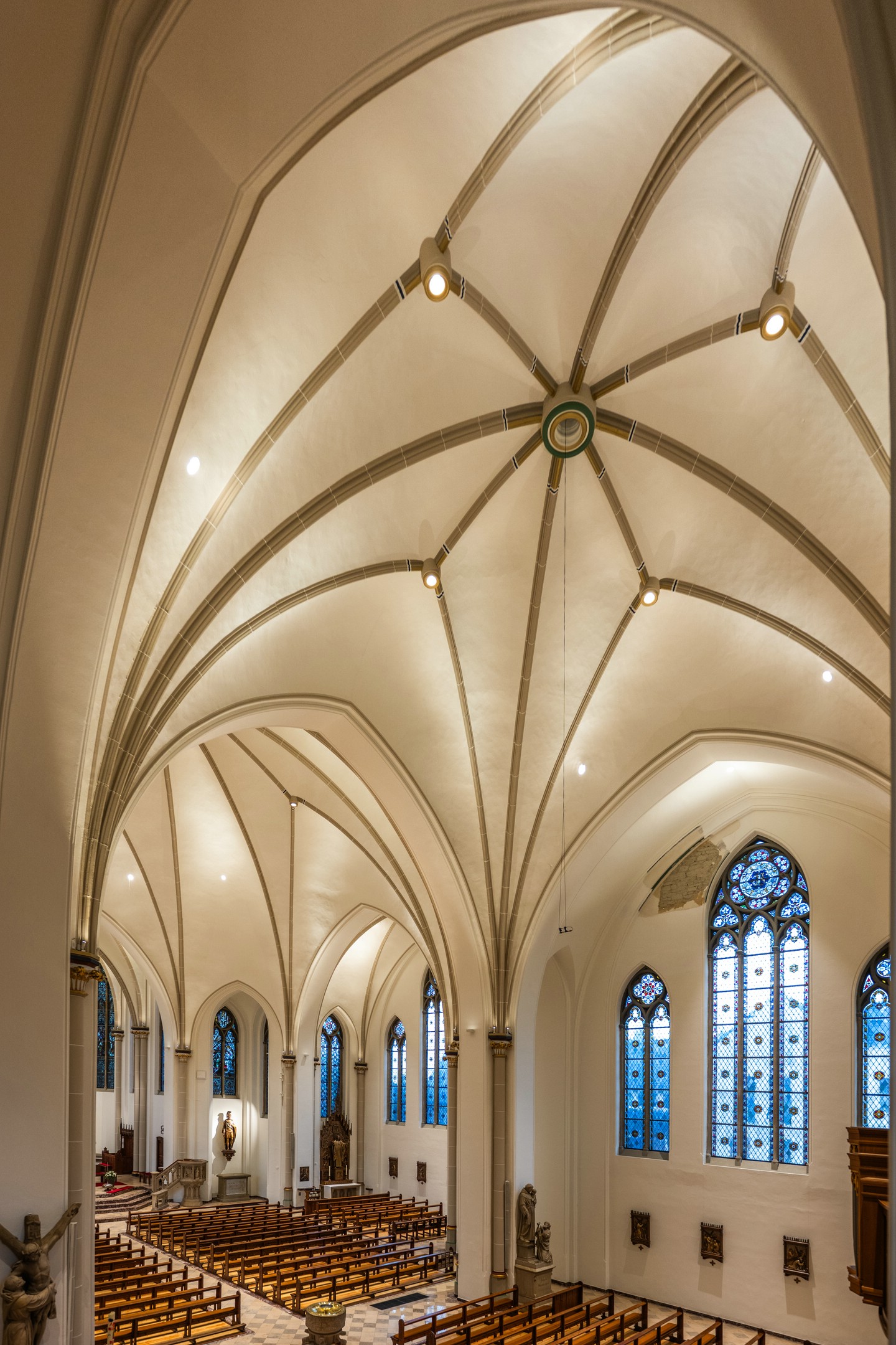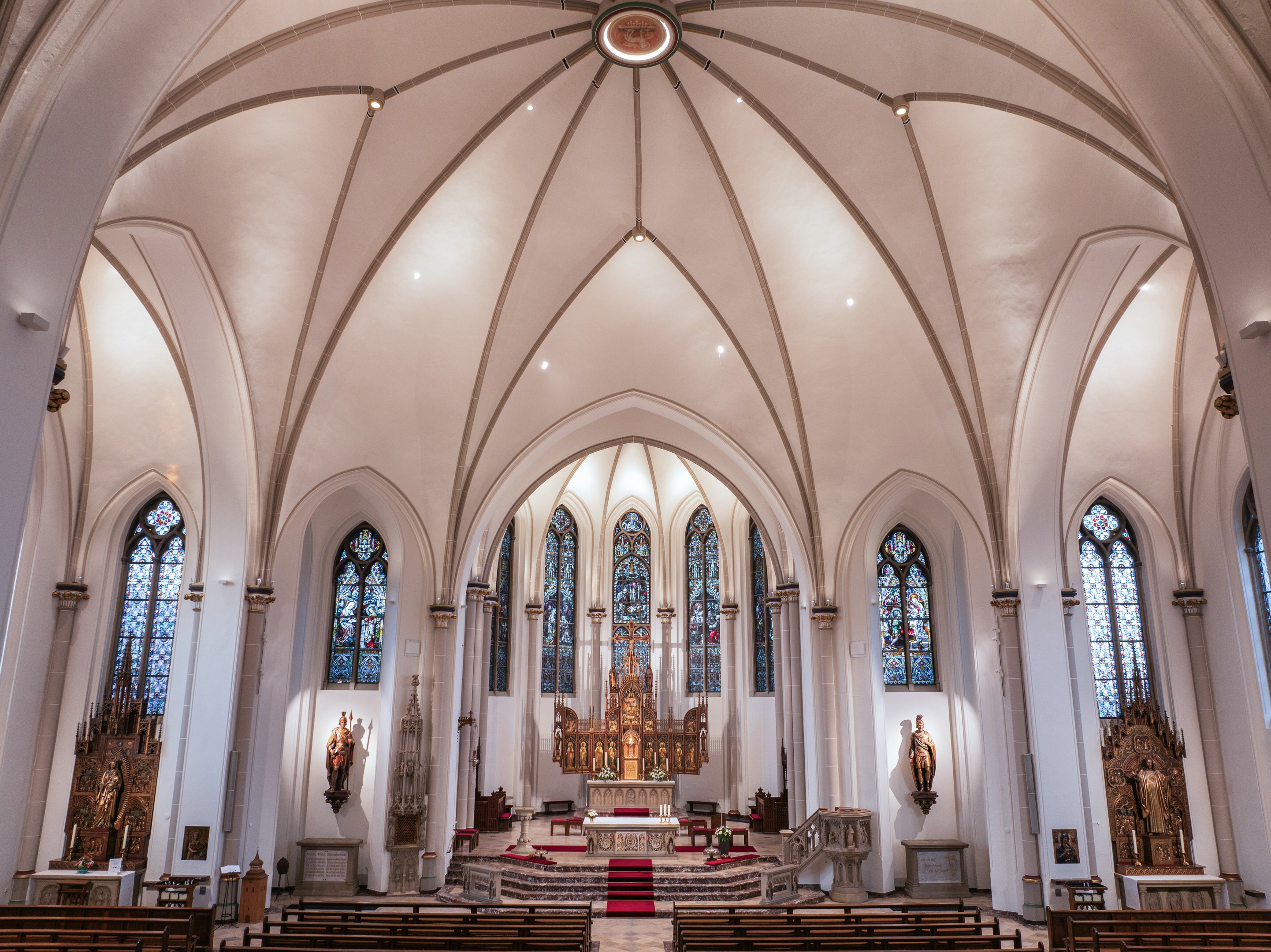 Die höhenverstellbaren Deckenspots hellen das Gewölbe der Vierung, dem Herzstück der Kirche, auf und lassen mit den Deckenflutern im Bereich der Vierungsbögen eine lichtdurchflutete Mitte entstehen. Im Chor und Altarraum sorgt gezielte blendfreie Beleuchtung für eine ausgewogene Helligkeit, die eine ruhigen, sakrale Atmosphäre schafft.