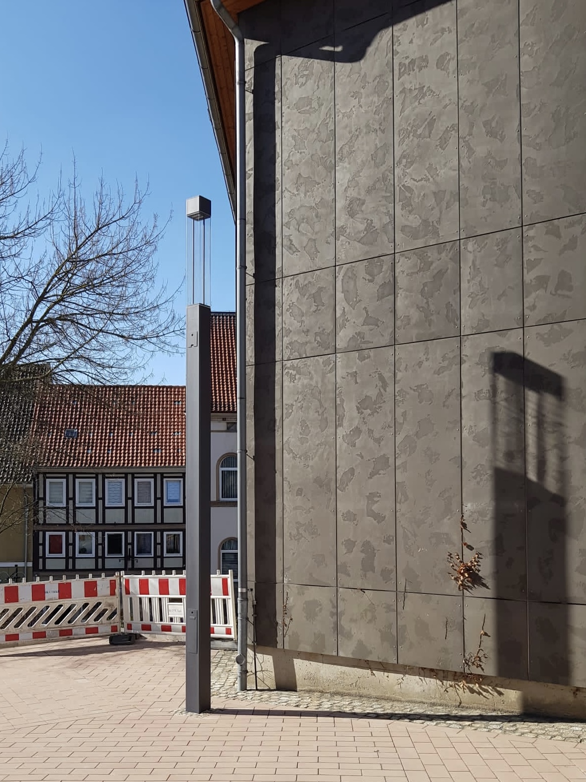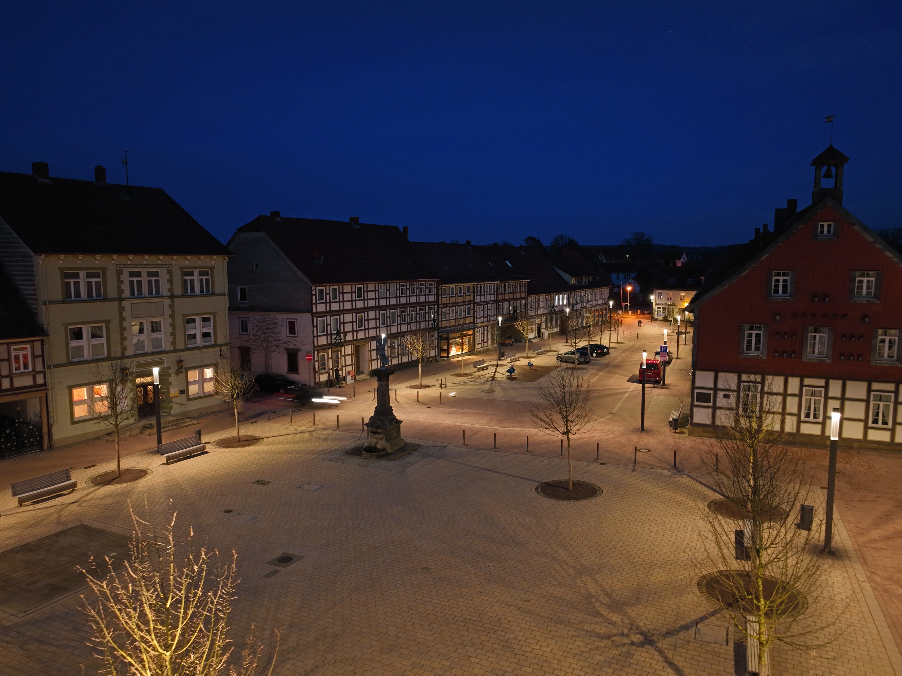 Angelehnt an die Struktur der Fachwerkfassaden geben die quadratischen Lichtstelen ein weiches, warmweißes Licht, dass nur durch die Reflexion des hellen Pflastermaterials eine gleichmäßige und dezente Aufhellung der Fassaden verursacht. Unterstütze von dezenten Lichtelementen im Platzbereich und einer ebenfalls beeindruckenden Fassade der St. Pankratius Kirche, die in den Abendstunden hervorgehoben wird.
