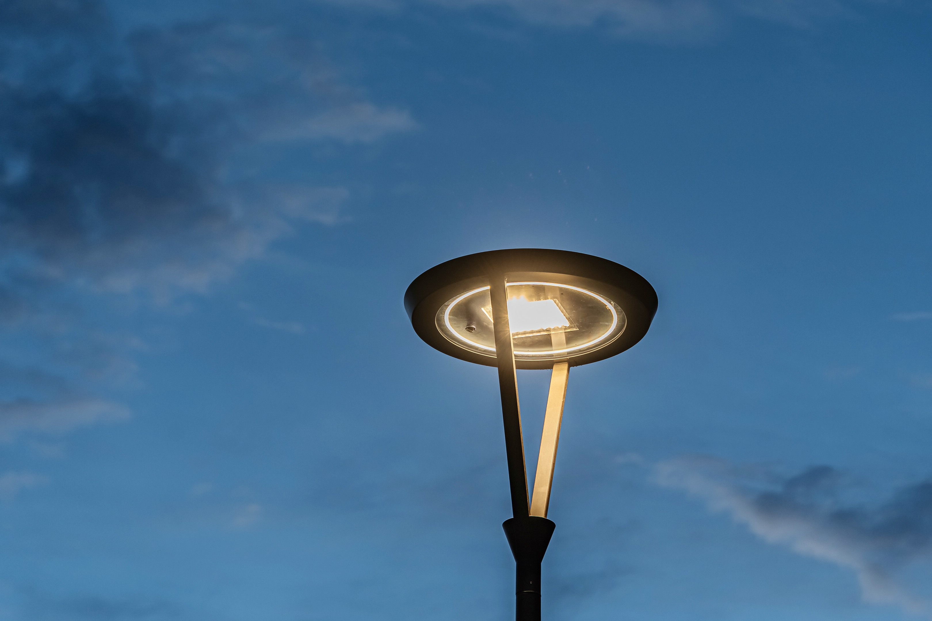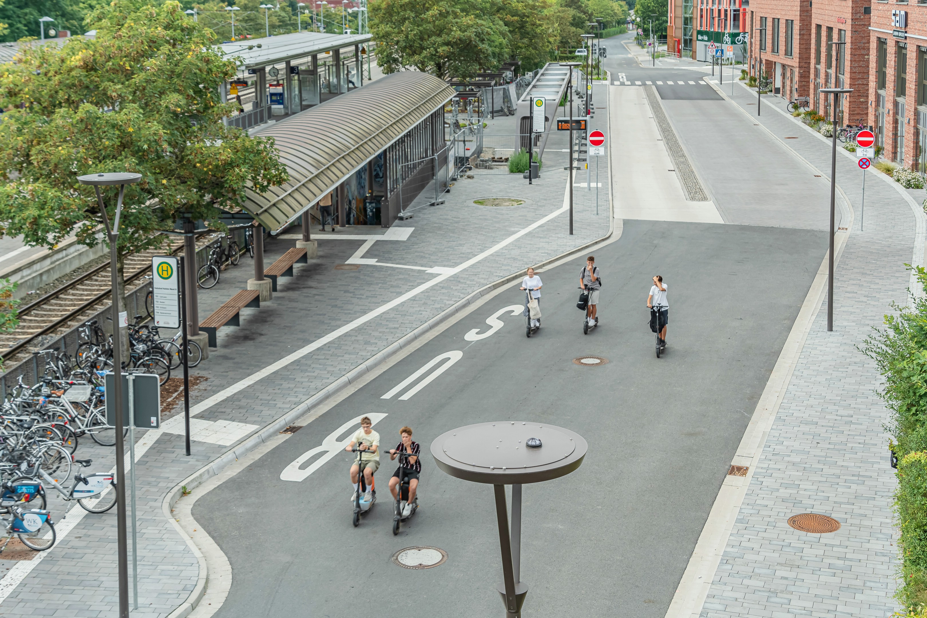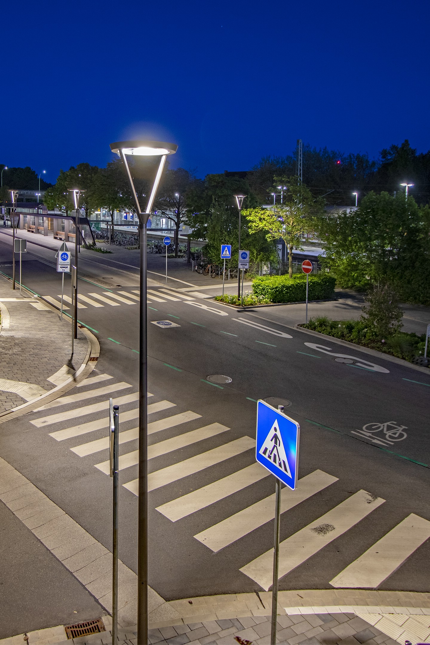 Ein modernes Lichtkonzept sorgt hier für Sicherheit, Orientierung und Atmosphäre. Speziell entwickelte multifunktionale Mastleuchten vereinen Straßen-, Radweg-, Haltestellen- und Fußgängerüberwegbeleuchtung in einem System. Der integrierte Lichtring reduziert Blendung und schafft eine harmonische Verbindung zum Buswartedach.