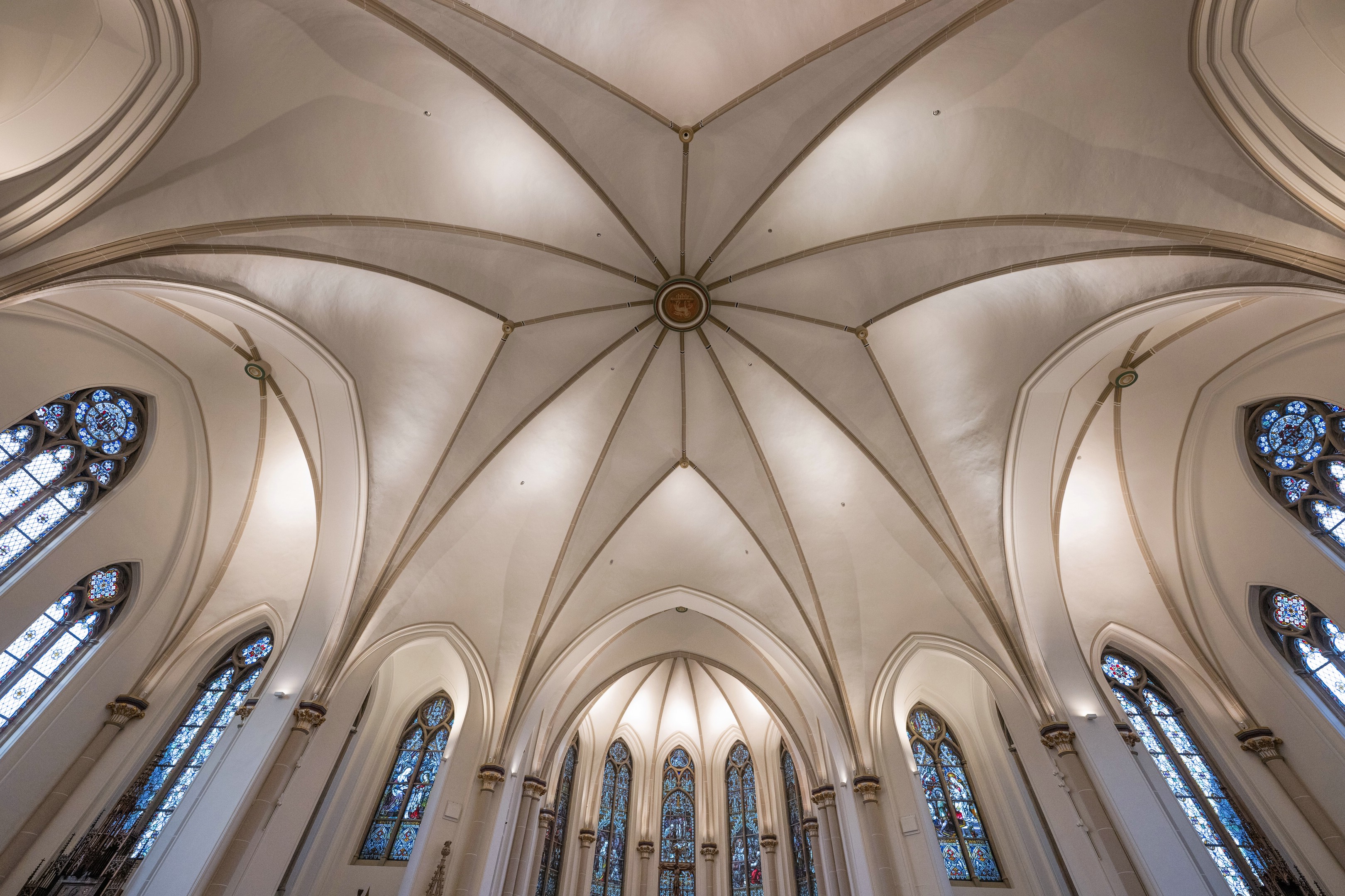 Die höhenverstellbaren Deckenspots hellen das Gewölbe der Vierung, dem Herzstück der Kirche, auf und lassen mit den Deckenflutern im Bereich der Vierungsbögen eine lichtdurchflutete Mitte entstehen. Im Chor und Altarraum sorgt gezielte blendfreie Beleuchtung für eine ausgewogene Helligkeit, die eine ruhigen, sakrale Atmosphäre schafft.